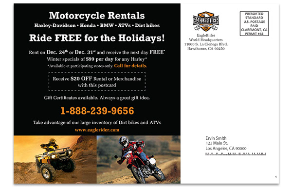 As part of EagleRider's monthly sales program a variable postcard was created to increase interest in recipients' eyes.
