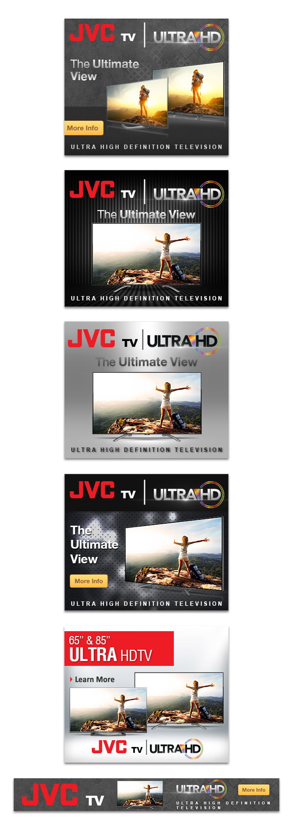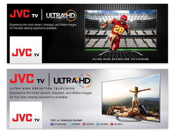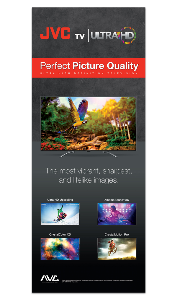 For their upcoming trade show, JVC TV needed a large rollup banner that highlighted their newest large screen model. The four key features of the TV were summarized at the bottom as graphics, for higher visual appeal.