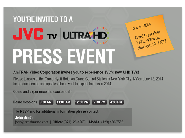 An email ready electronic invite card was created to send to select press for JVC TV's press event.