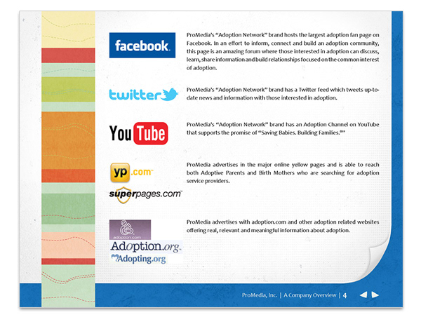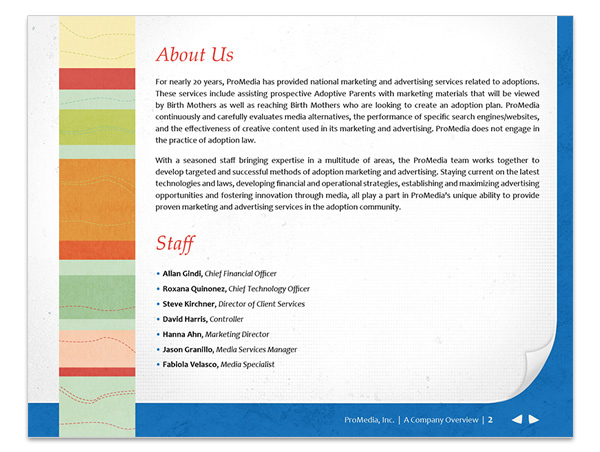 A booklet in the form of an interactive PDF that encompasses who ProMedia, Inc. is as a company and gives an overview of the types of services provided. PDF is emailed to potential companies that wish to form partnerships with ProMedia, Inc.